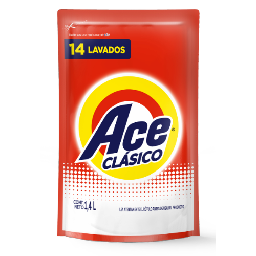 Contenido: 1.4 litros | Tipo: Jabón líquido para ropa | Presentación: Doypack | Marca: Ace | Categoría: Jabones líquidos